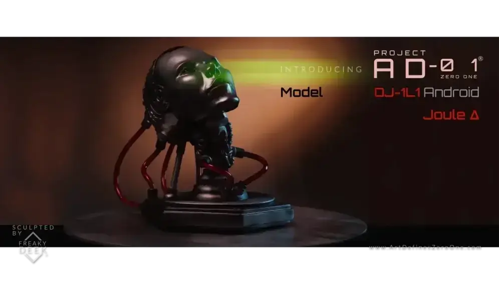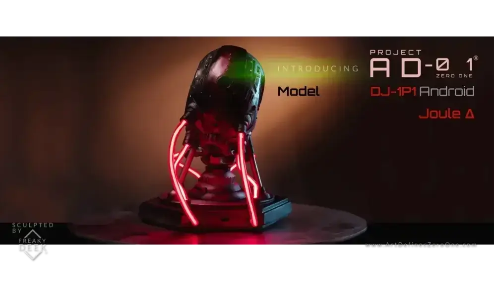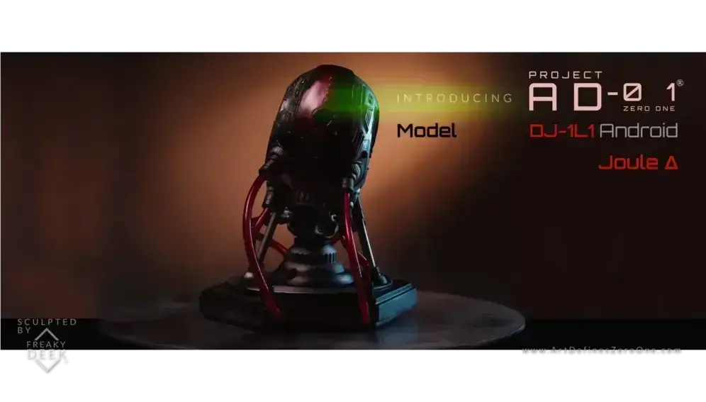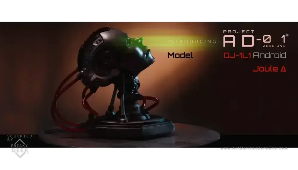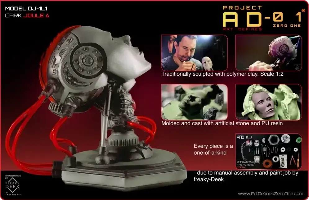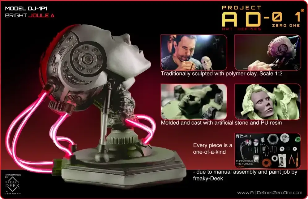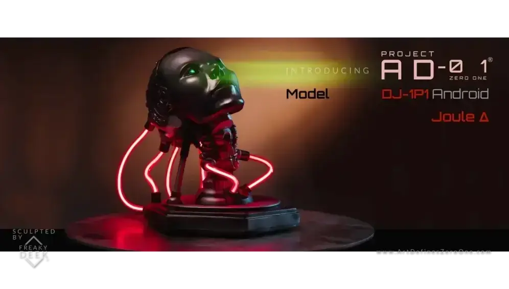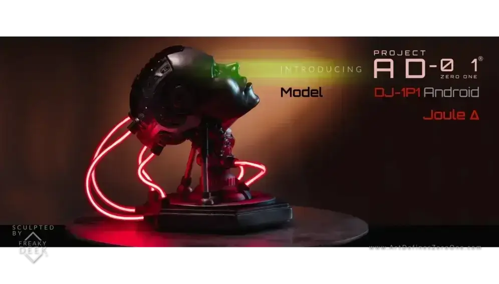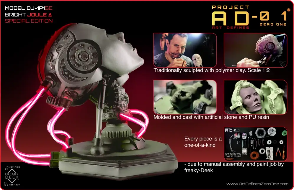Project AD-01’s Joule Δ is a handcrafted android sculpture by artist freaky-Deek, embodying the fusion of human creativity and technological advancement. Each piece is meticulously sculpted from polymer clay, molded, cast, painted, and assembled by hand, ensuring a unique and personal touch.