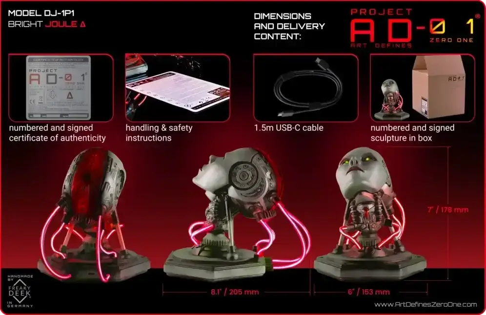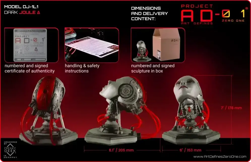 Project AD-01 Joule Δ sculptures are designed and crafted by freaky-Deek, an artist known for their unique blend of creativity and craftsmanship.