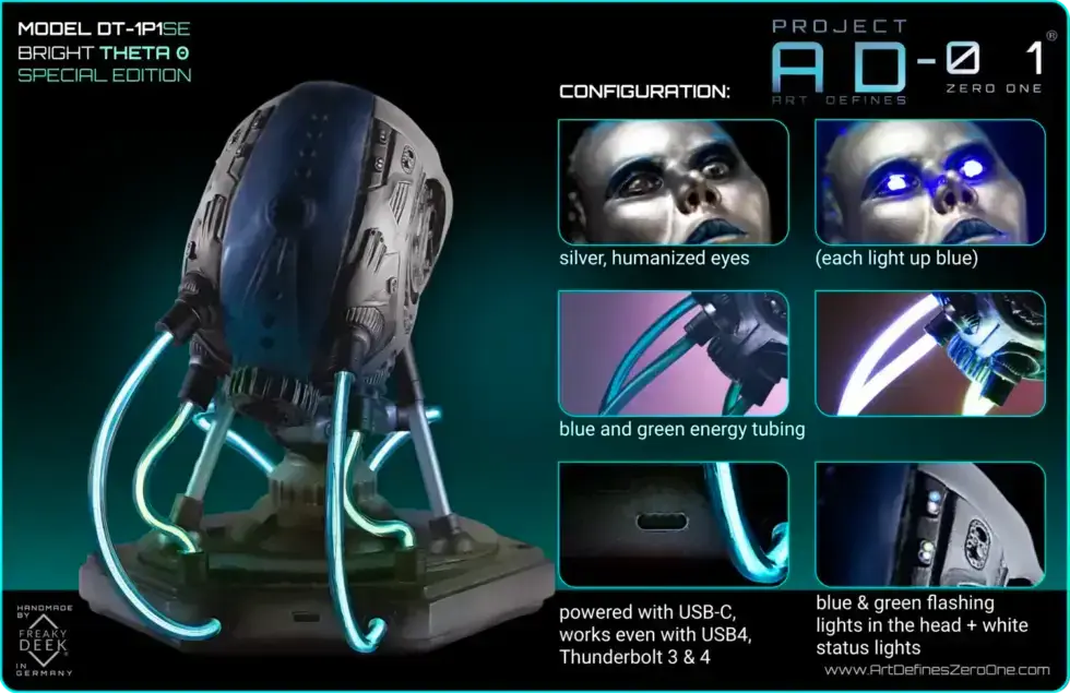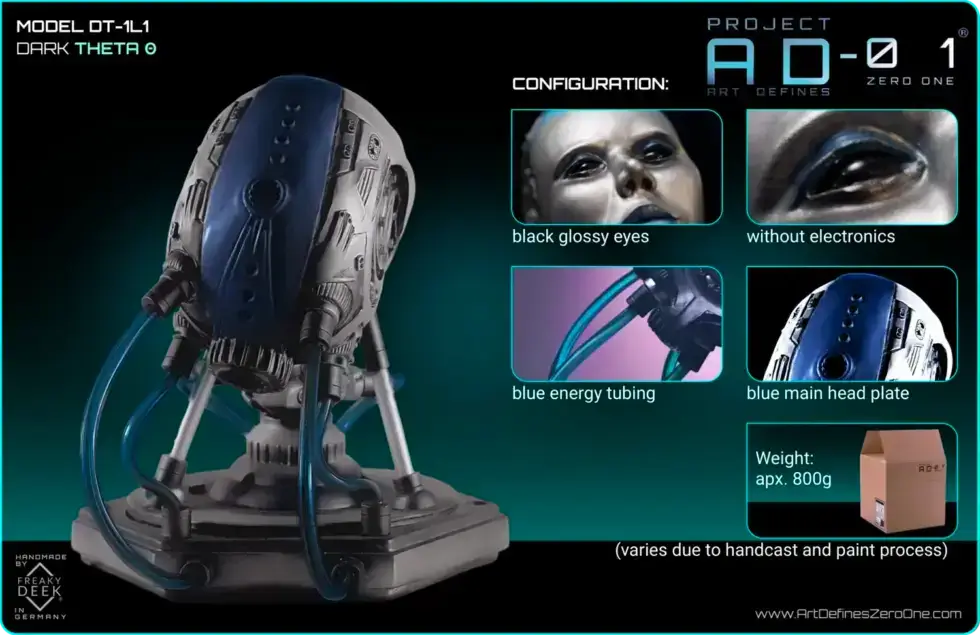 Project AD-01’s Theta Θ is a handcrafted android sculpture by artist freaky-Deek, representing the pinnacle of technological advancement and artistic expression. Each piece is meticulously sculpted from polymer clay, molded, cast, painted, and assembled by hand, ensuring a unique and personal touch.