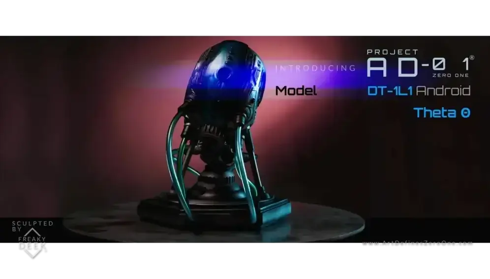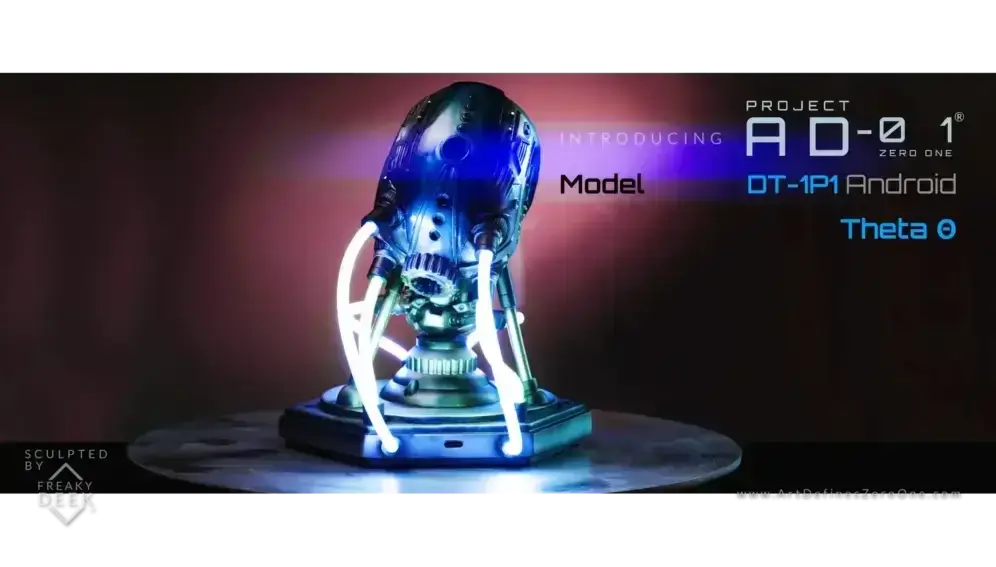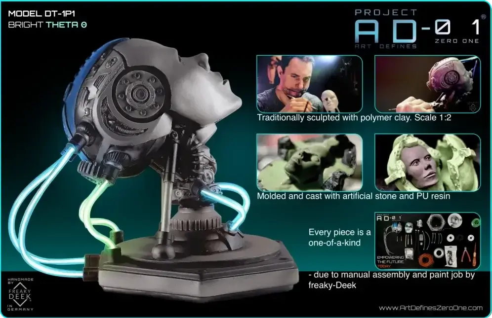 Project AD-01 – Model DT-1P1 Android THETA is created by freaky-Deek, an artist known for blending creativity with technological innovation to produce unique sculptures that challenge conventional perceptions.