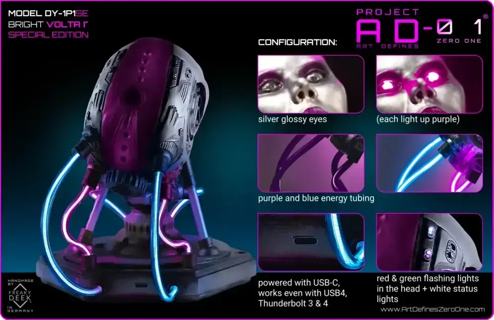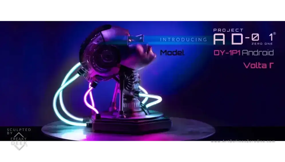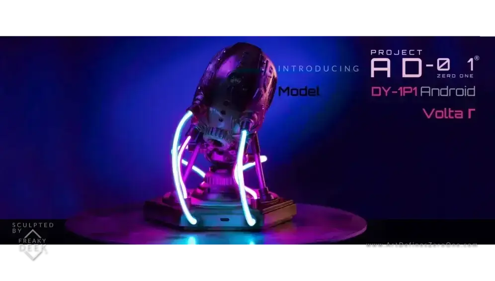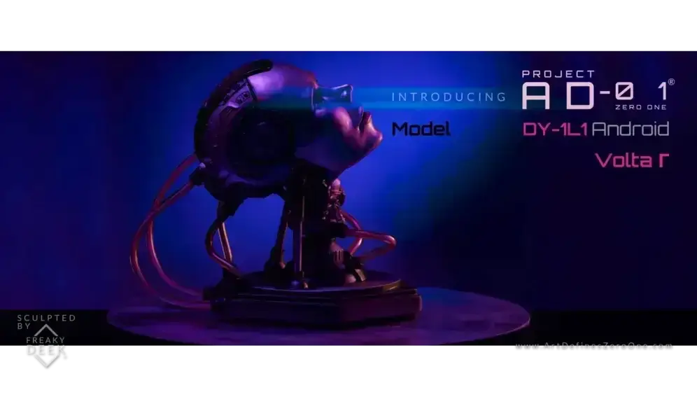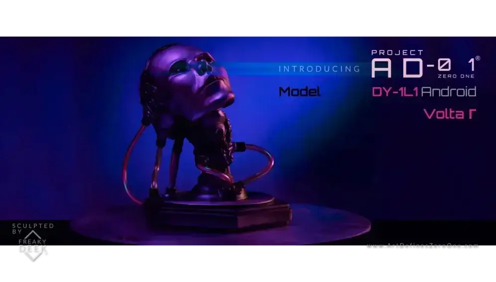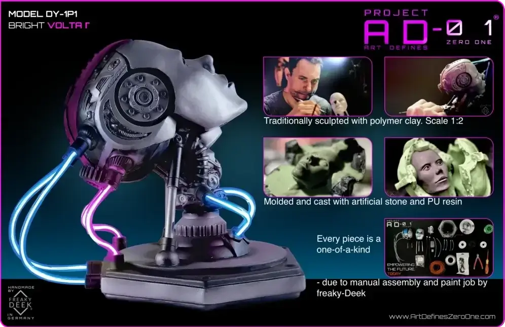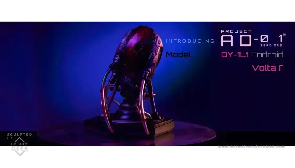 Project AD-01’s VOLTA Γ is an original handcrafted android sculpture by artist freaky-Deek. Each piece is sculpted with clay, molded, cast, painted, and assembled by hand, ensuring an artisanal level of craftsmanship.