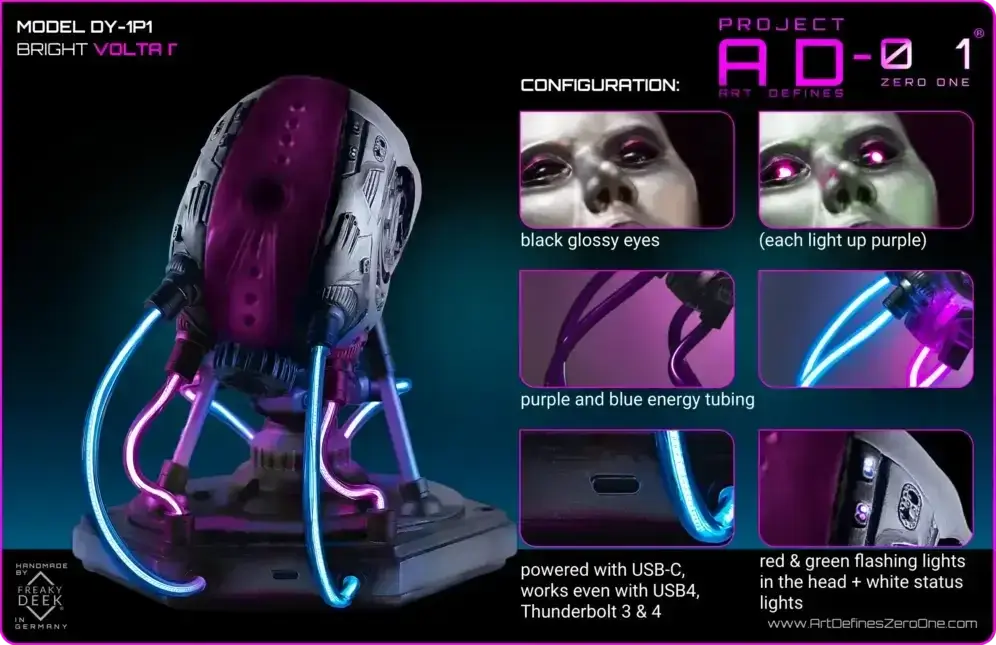 The DY-1L1 model is a non-electronic sculpture featuring black glossy eyes and a purple main head plate. The DY-1P1 model includes electronics, offering options like LED-lit eyes, blue and purple energy tubing, and various status lights, and is powered via USB-C.