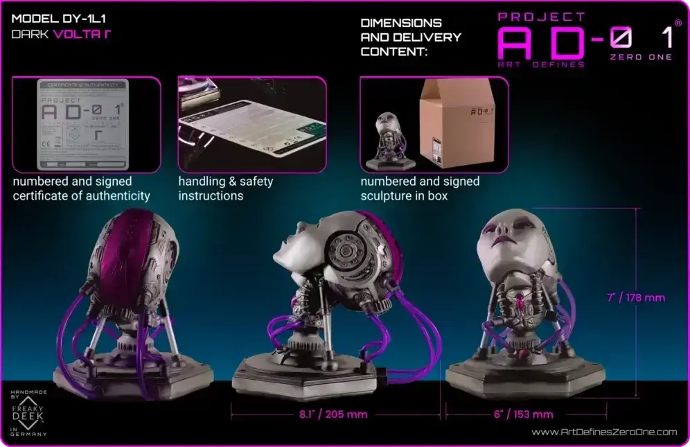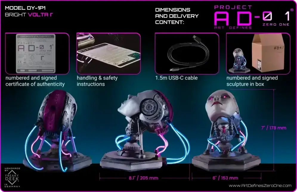 Each VOLTA Γ sculpture comes with a handmade android bust, a numbered and signed certificate of authenticity, handling and safety instructions, and a USB-C cable for electronic models.
